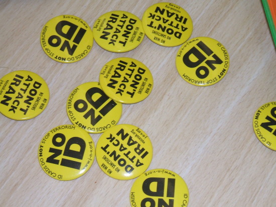Regarding the Justice Not Vengeance Anti-ID badges (fourth photo), unfortunately there's a big problem with this "ID cards do not stop terrorism" argument.