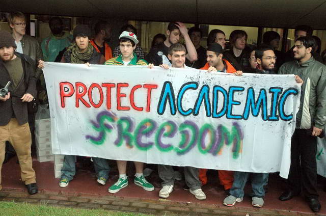 Strong concerns were voiced over academic freedom at the university, in addition to a focus of support and solidarity with one of the arrested, Hicham Yezza. Hicham’s arrest took place on Wednesday 14th May. Rizwaan Sabir, an MA Politics research student was also arrested. Both were released without charge six days later. It has subsequently become clear that these arrests, which related to so-called “radical materials” involved an Al Qaeda manual downloaded by Sabir from an official US Government website, as part of his dissertation research into political Islam, and emailed to Yezza for printing.