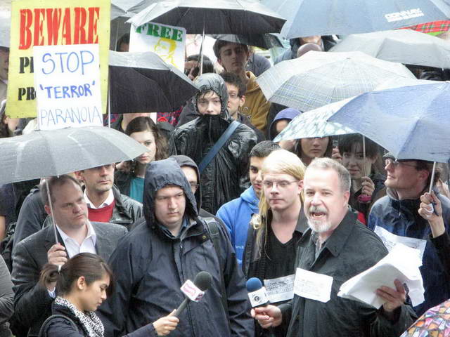 Alan Simpson, MP for Nottingham South attended to show his support for the demonstration. He described the arrests as a "dreadful cock-up". Addressing the university authorities he said, "how ashamed you should be of yourselves. How ashamed that you cannot come to the defence of one of your staff." Speaking on the terror legislation Simpson said, "we would live in a society where we fear each other and that is what the treatment of Hicham and Rizwaan actually demonstrates."