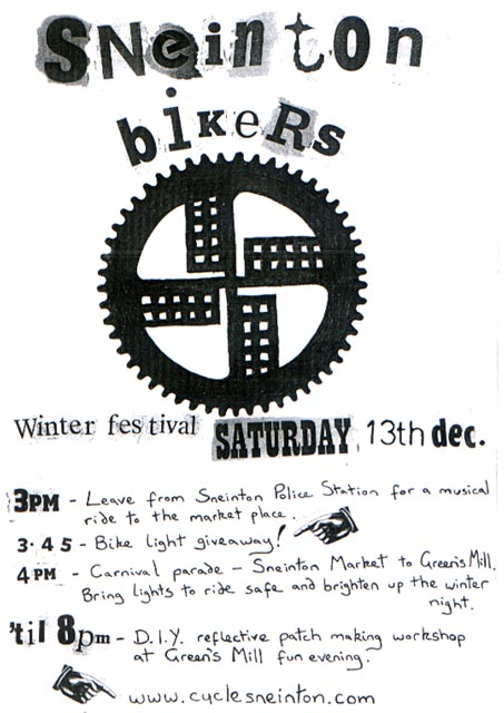At the Windmill we will run a Scotchlite Reflective Patch making workshop. We are also hoping to get funding to give away free Bike lights to all riders. If you would like to ride with us please let us know. www.cyclesneinton.com or just show up with bikes and lights. Police Station 3pm. Sneinton Market 4pm. Greens Windmill 5 til 8pm.