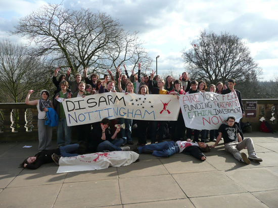 This protest is being called by 'Disarm Nottingham' a broad-based coalition of societies and individuals working to end university links with the arms trade. contact: