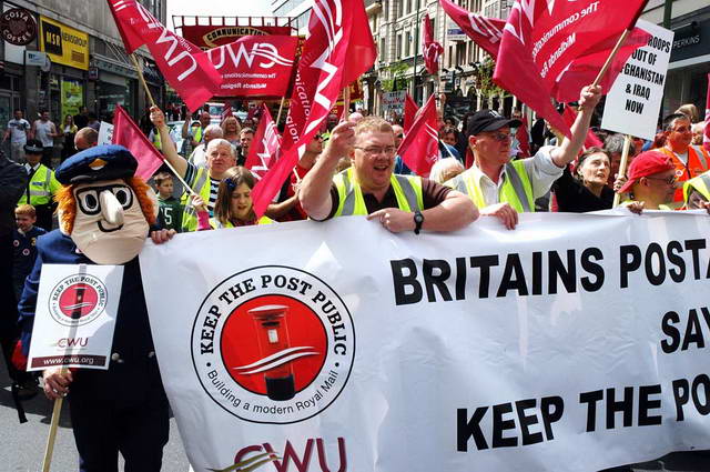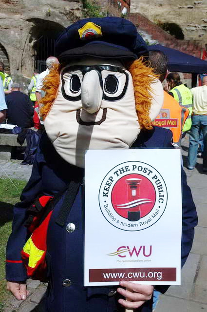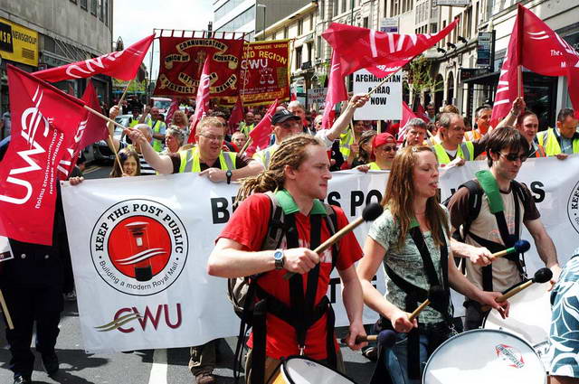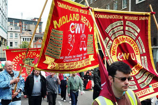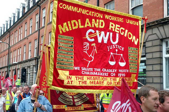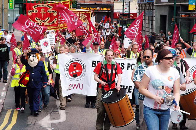 Many different groups and campaigns came together in a show of May Day solidarity. The object, to demonstrate opposition to racism, climate change, job cuts, asylum injustice, arms manufacturers and the oppression that we witness daily. Making connections between issues and celebrate our resistance to them. There was a main presence from the Communication Works Union, to draw attention to post office closure / redundancies / pensions / privatisation.