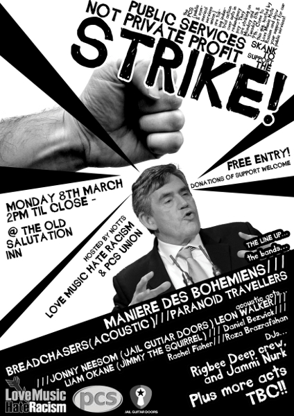 Love Music Hate Racism will be holding a solidarity gig at the Old salutation Inn, Maid Marian Way from 2pm to late. Artists include Maniere des Bohemiens, Breadchasers, Paranoid Travellers, Jimmy Squirrel, the Rigby Deep crew and others.