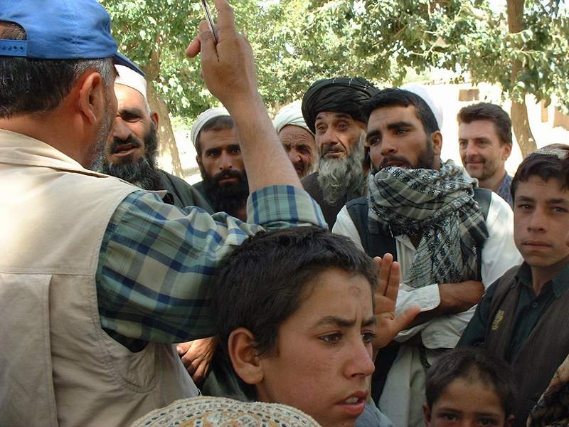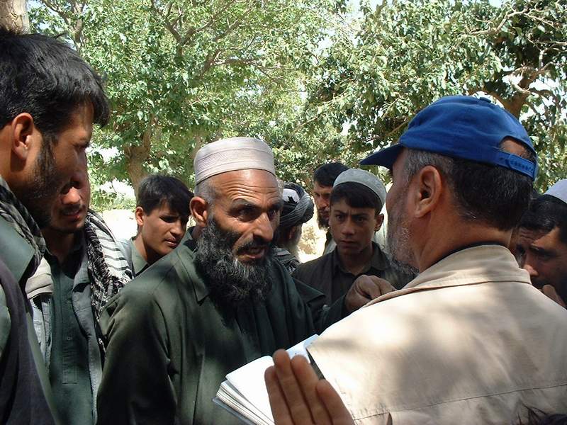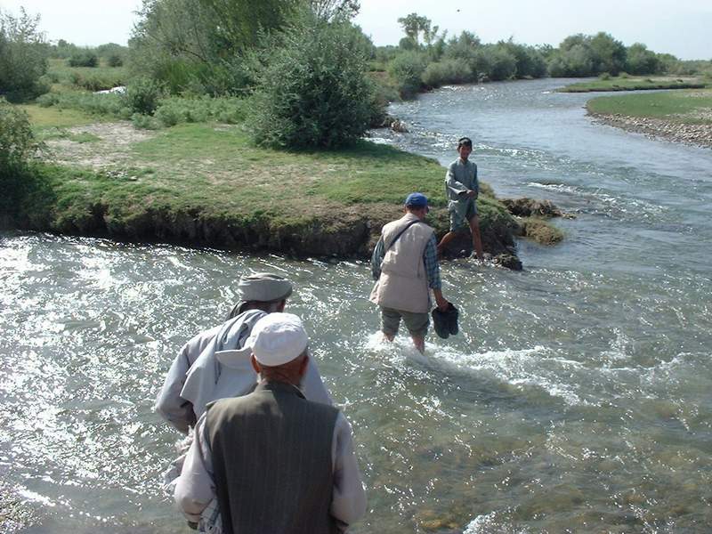 On 7th July 04 IOM/ATI team went to Parwan to assess potential new projects. After bouncing over dirt roads for some time the team arrived at khlazayee village. The community leaders quickly surrounded us desperate for assistance. While neighboring villages have wells and hand pumps this Pashtun one doesn’t. One man said, ‘Our women have to go to other villages and ask to use their water. This makes us loose pride.’ For relatively little money ATI/IOM could not only supply much needed water but restore some dignity to this village. Later the same day we reached another village with water problems. This time too much and in the wrong place. They wanted a restraining wall but to get to the site consisted of a two-kilometer walk involving a few river crossings (see photos). On arrival they explained that while they used to get some annual flooding this had been exacerbated by a restraining wall built by a local commander to divert the river and protect one of his villages from flooding. The community representatives asked ATI/IOM to build another wall to protect their arable land and showed fields covered in silt from the last flood. It was evident that there was some conflict between the two villages and that another wall while preventing extensive damage to arable land might increase this conflict. ATI/IOM asked the RRD representative to come up with some definite plans for the wall and diversion of the stream. The village elders were asked to arrange a meeting with representatives of the other village, the commander, RRD, and a representative of the governor to discuss the plans and if all agreed and signed a letter stating this ATI/IOM would look at the possibility of the project. (See photos).