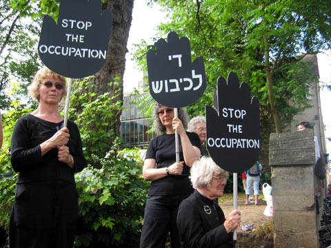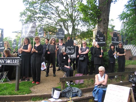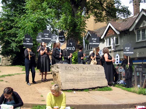 On Saturday 17 July a group of around two dozen women, all dressed in black and holding giant black hands or placards, stood silently in Bonn Square for just over an hour, while one or two of their number handed out leaflets to passers-by. The aim of the vigil was to protest against the illegal Israeli occupation of Palestine. Many local people stopped to talk with the leafleters and expressed support for their aims. Heartened by the success of this dignified demonstration, the organisers, the Oxford women’s group NOW, have decided to hold regular Women in Black vigils in the future. The next one will be held on July 31, probably in Bonn Square again, but hopefully with less aerial bombardment by the pigeons.