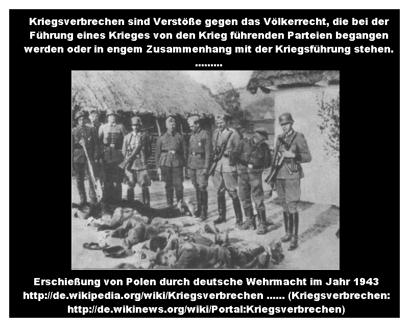 http://www.imi-online.de/2002.php?id=2308 Picture: Kriegsverbrechen sind Verstöße gegen das Völkerrecht, die bei der Führung eines Krieges von den Krieg führenden Parteien begangen werden oder in engem Zusammenhang mit der Kriegsführung stehen. ....... Erschießung von Polen durch deutsche Wehrmacht im Jahr 1943