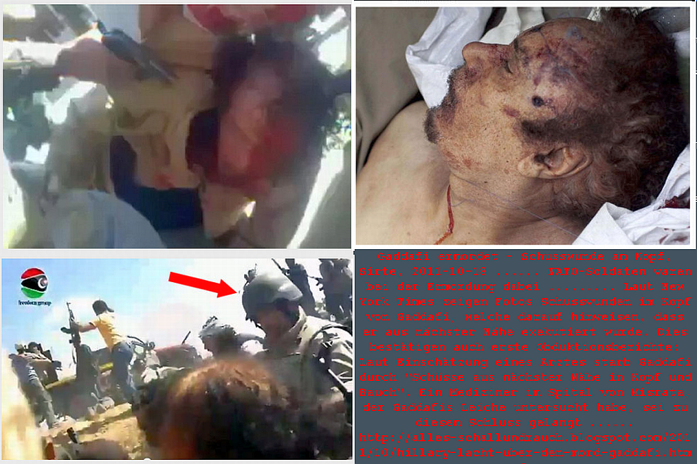 http://www.jungewelt.de/2011/10-28/049.php Picture: Gaddafi ermordet - Schusswunde am Kopf, Sirte, 2011-10-18 ...... NATO-Soldaten waren bei der Ermordung dabei ......... Laut New York Times zeigen Fotos Schusswunden im Kopf von Gaddafi, welche darauf hinweisen, dass er aus nächster Nähe exekutiert wurde. Dies bestätigen auch erste Obduktionsberichte: Laut Einschätzung eines Arztes starb Gaddafi durch "Schüsse aus nächster Nähe in Kopf und Bauch". Ein Mediziner im Spital von Misrata, der Gaddafis Leiche untersucht habe, sei zu diesem Schluss gelangt ......