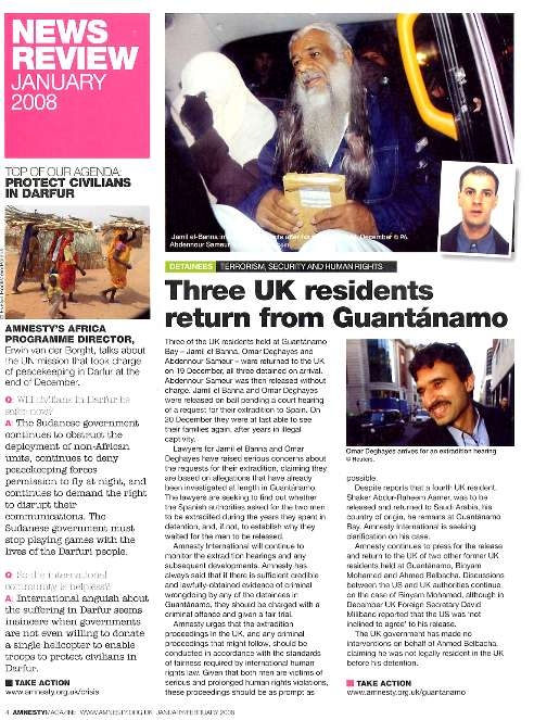 Omar Deghayes and Jamil El-Banna, both released with no charge from Guantánamo Bay in Dec 2007, will appear at Westminster Magistrates Court, Horseferry Road, London on Thursday, February 14th at 10am. The hearing is in connection with a request from Spain for their extradition to face charges there.