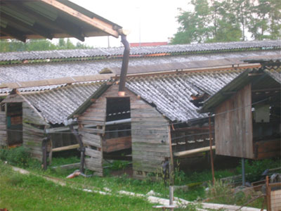 The walls of the sheds still have messages painted by activists who previously visited this farm, and the building that houses cold storage and warehouses has no roof, which was probably destroyed in the fire of 2006*.