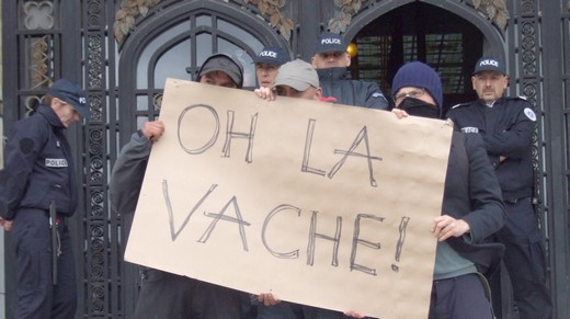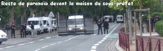 The march started at 2.30pm from the "food distribution" cite on Rude de Moscou where sans-papiers are handed their daily gruel, through the main square Place d'Armes and the thoroughfare Rue Royale, ending at the Mairie (Town Hall). At the town hall a wedding party was still going on and blended with the demo's sound system, while cops blocked the doors of the building and riot police were seen waiting inside. With the presence of many undocumented migrants on the march no one was looking for trouble, and the police stayed calm for once in this town. It was a rare chance for migrants in Calais to make themselves seen and heard, occupying the streets, shouting and waving Banners and hand-made placards in many languages.