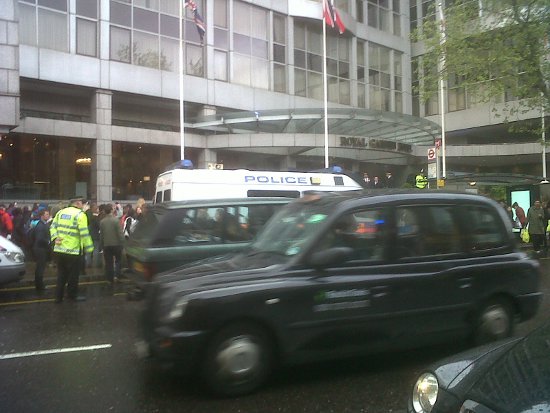 In a surreal twist the protest was joined by 300 Justin Bieber fans, who had heard rumours that Bieber was staying at the hotel.