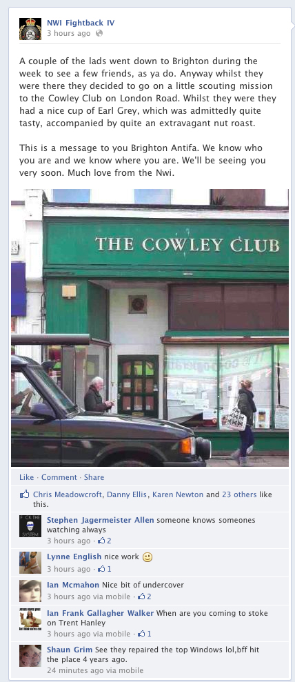 On 16 Feb 2013 the Facebook page of openly Nazi EDL spin-off group the North West Infidels published photos of the front and back entrances of the Cowley Club in Brighton (see screen-grabs), describing the club as "Antifas shithole" (sic). The photo of the front was posted with a comment that says "A couple of the lads went down to Brighton.... on a little scouting mission to the Cowley Club.... This is a message to you Brighton Antifa.... We know who you are and we know where you are.... We'll be seeing you very soon". In might of the arson attack on the Freedom Bookshop down in London, this threat should be taken seriously. Readers in Brighton please pass this info to the Cowley Club absolutely ASAP, and the club should take immediate steps to make certain their premises are secure and that their fire protection, CCTV and insurance etc are up to covering a worst possible scenario.