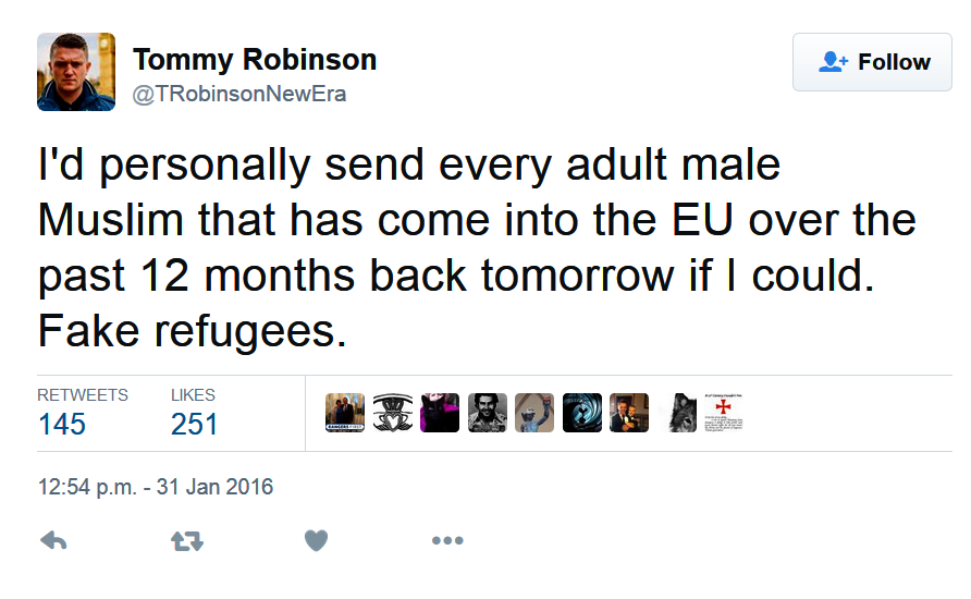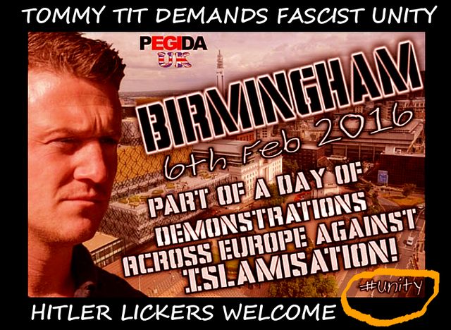 Tommy tweeted last weekend that he will deport all Muslim men if he ever comes to power, which makes him just as extreme as the National Front or National Action. The danger posed by Pegida UK must not be taken with a pinch of salt, as if there is no direct action to disrupt his hate marches, they will slowly but surely grow. Just one punch thrown in anger however, and his reputation will be in tatters to the extent he will not even get interviews on rabble-rousing LBC. if Tommy Tit doesn't leave in floods of tears at wrecked plans for his future Forth Reich, ANTIFA are not doing their jobs properly.