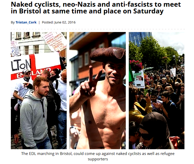 http://www.bristolpost.co.uk/Naked-cyclists-neo-Nazis-anti-fascists-meet/story-29352251-detail/story.html Hot and sweaty jockstraps parading into Bristol the same time as Dowden's Nazi troops is sure to get the SWI's drunken and sexually confused morons hot and bothered, especially if it is a warm day as the weathermen are predicting. It won't be "raining men", more like "raining fists", however, if fellow fascists let their love fly - any member of the SWI openly shouting "hallelujah" at the arrival of the naked cyclists is sure to get the far right demo kicking off big-time. Things will ultimately turn nasty if their homophobic gets the better of them.