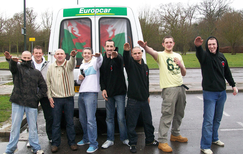 The Powell brothers became notorious after being photographed among the Sieg Heiling Nazis of (Casuals United founder) Jeff Marsh's EDL branch the Welsh Defence League, during the WDL demo in Swansea, 17 Oct 2009; but, after the Powells had been exposed as Nazis, the EDL still chose Bryan Powell to steward an EDL march in London, 5 March 2010.