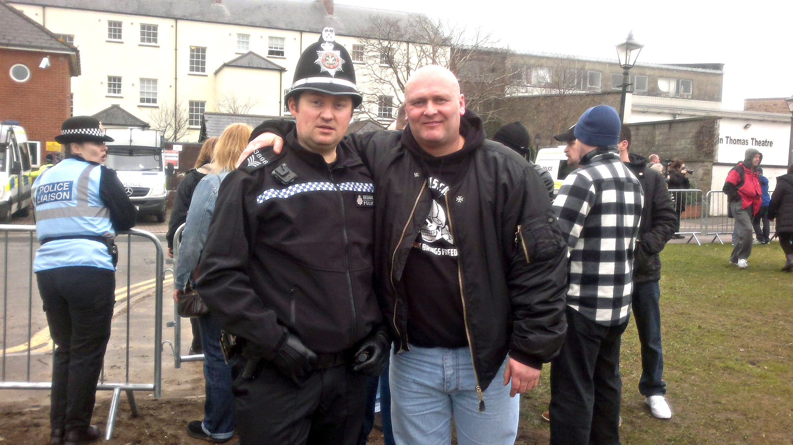 On the 9th March 2013 former English Defence League demo steward Bryan Powell & Welsh Defence League & Casuals United organiser Luke Pippen, organised an openly Nazi "White Pride" rally on behalf of South Wales NF in Swansea, drawing a small crowd of hard-core Nazis from all over Britain. The Nazis flew flags of the NF and of violent race-hate groups like Blood & Honour, yet South Wales (Heddlu) Police officer (collar number) 3896 was evidently willing to have his photo taken (possibly by Bryan Powell), posing with ex-EDL activist and Nazi Wayne Baldwin (see photos). For anyone who thinks this might have resulted from an innocent misunderstanding, Wayne Baldwin was already well-known to South Wales Police from national media coverage of EDL & WDL demos, and even if officers hadn't been properly briefed about the "White Pride" demo, Baldwin's "deaths-head" SS t-shirt & Swastika badges were still a bit of a give-away!