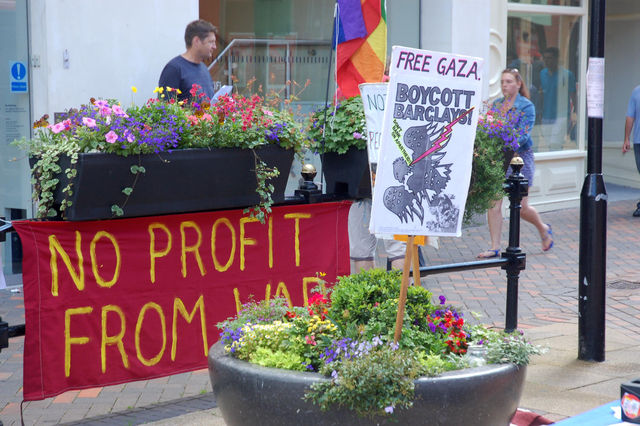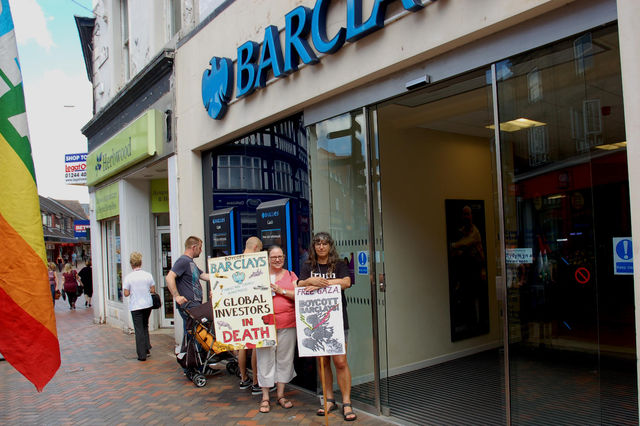 For those of you not in Wrexham, there are Barclays Banks and other companies that invest in Israel all over the place. If you want more information, then this Corporate Watch publication Targeting Israeli Apartheid (free download here) is a good place to start.
