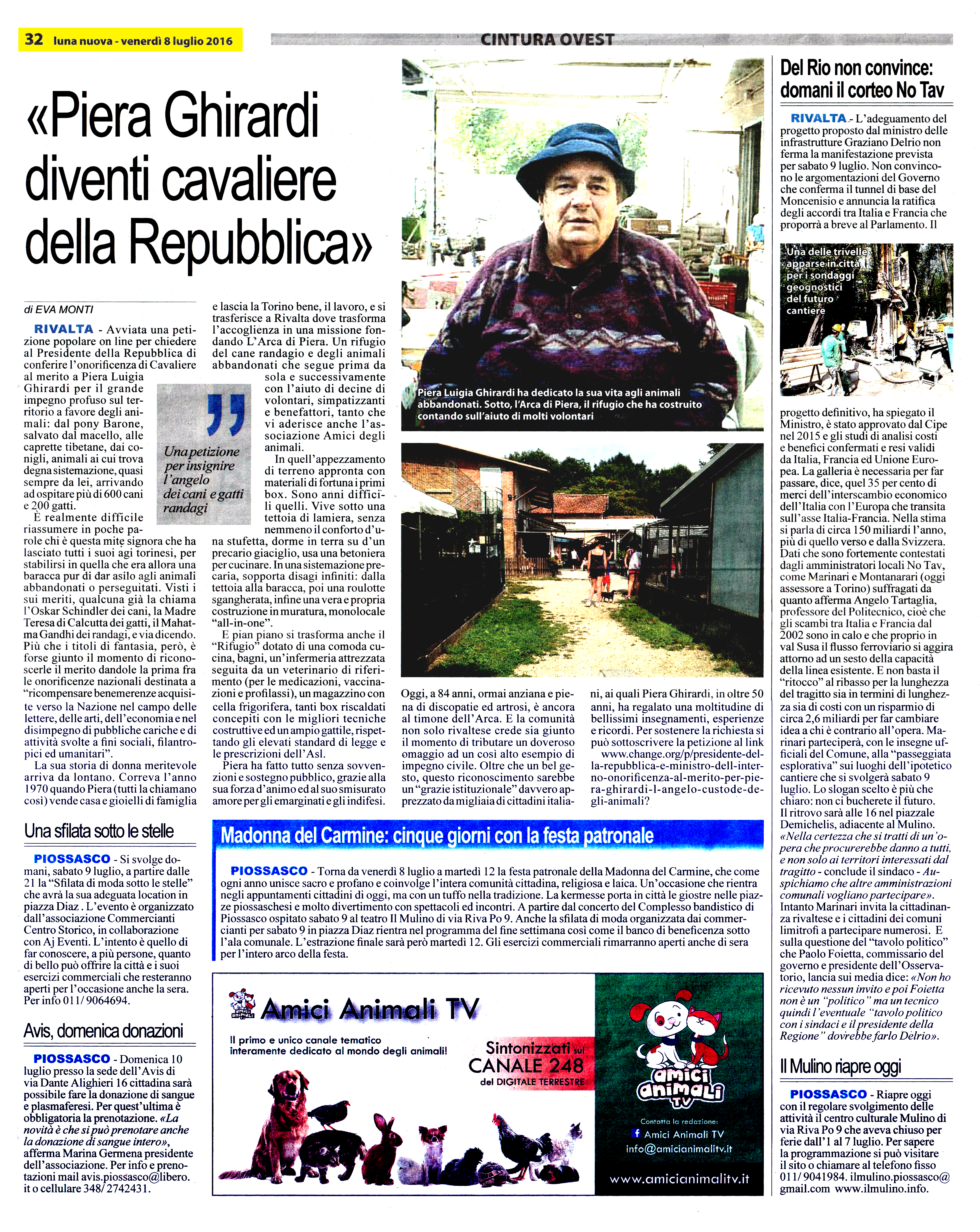 Articolo di oggi (8 luglio 2016) de "la Luna Nuova" dedicato a Piera Ghirardi