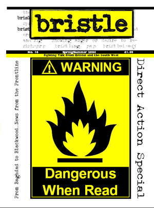 Our website www.bristle.org.uk and the associated email is under reconstruction. For now you can email us at  bristlemag@yahoo.co.uk. The mag costs £1.50, and is available widely in Bristol, from the Porter Butt pub/Harvest Foods/Sub-basement (all Bath), Harlequin Books (Totnes), Speaking Tree (Glastonbury). If you are outside Bristol send a cheque payable to ‘Bristle’ to Box 25, Greenleaf Books, 82 Colston St, Bristol, BS1 5BB and we’ll bung one in the post. Alternatively you can get it via mail order from AK Press and Active Distribution. Active will also be putting it in Freedom bookshop & 56A Infoshop (London), and Cowley Club (Brighton), for us.
