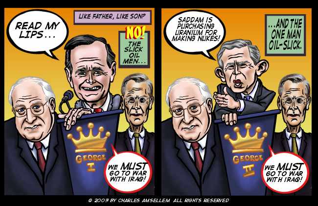 Without even mentioning the Gulf of Tonkin, America has mislead its people onto the warpath throughout it's history. With all of the hoopla about pResident Bush's State of the Union speech blunder, in which he stated that Saddam Hussein was attempting to purchase uranium from Niger, the press has neglected to portray how history is repeating itself. In the last high level meeting between the USA and Iraq before both countries would descend into a major conflagration, US ambassador to Iraq, April Glaspie met with Saddam Hussein to virtually give him the green light to invade Kuwait: "We have no opinion on your Arab-Arab conflicts," said Glasbie in the transcript of this meeting, "such as your dispute with Kuwait. Secretary [of State James] Baker has directed me to emphasize the instruction ... that Kuwait is not associated with America." It should be noted that the revlelation of this dialogue occured months before American troops were unleashed over the Kuwait border.