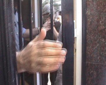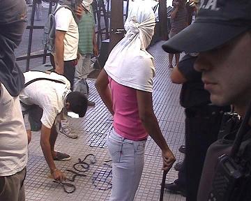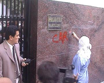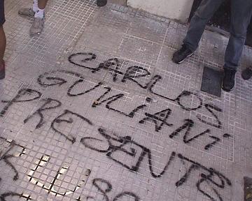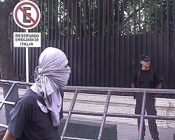In front of the embassy some speeches where hold and a petition were given to the Italian ambassador. He gave the agreement to forward the message to the Italian government. At the end of the rally some slogans like: "Carlo Giuliani - presente" (Carlo Giuliani-present); "Berlusconi-Asessino" (Berlusconi-murderer); "Libertad para los compañeros de Genova" (Freedom for the comrades in Geneva); "Italia fuera del Irak" (Italia – Out of Irak) where sprayed to the wall of the embassy. The facade and the front door where brighten up by a bucket full of paint and inkeggs.