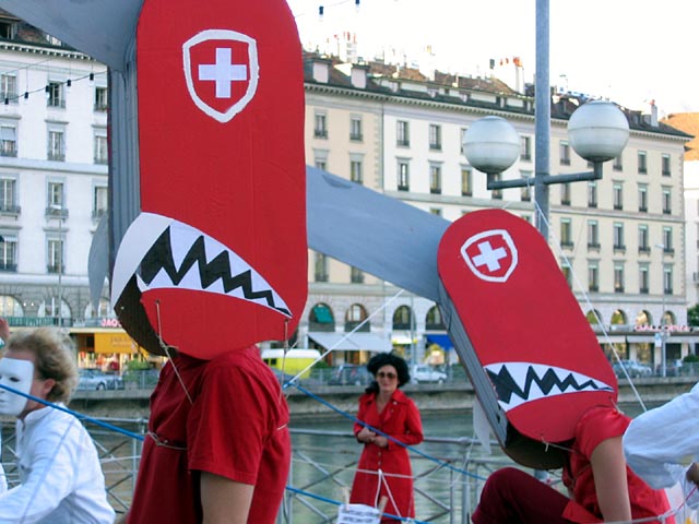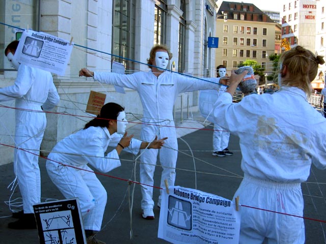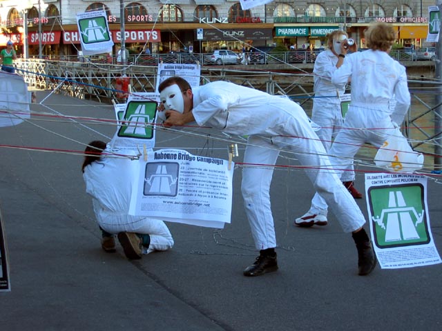 Theatre group block geneva bridge in support of Aubonne defendants.