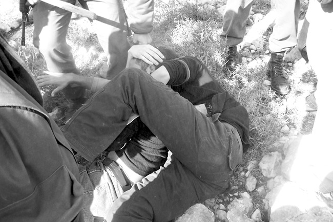 The soldiers forced the demonstration up the hill into the village. They remained on the edge of the village for some time, continuing to target the children defending their land by stone-throwing, with sound bombs, tear gas, and plastic-covered bullets. Five Palestinian men were wounded, three of whom were hospitalised. One was injured by beating, two by sound grenades, and two were shot with plastic-coated bullets, one in the stomach and one in the back.