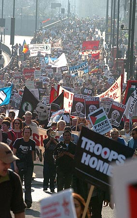 The "Troops Home" demonstration was organised by the Stop The War Coalition, CND and the Muslim Association of Great Britain, and followed several days of activities at a Peace Camp set up in Trafalgar Square [see pics 1 | 2].