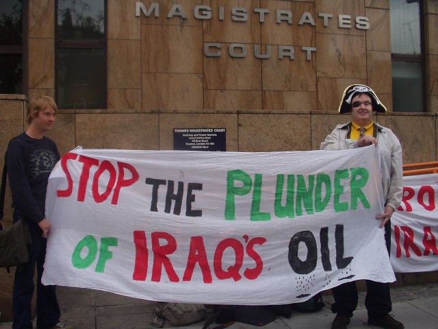 pirates, carrying a banner saying ‘STOP THE CORPORATE PLUNDER OF IRAQ’ will be outside the court from 9.30am to help draw attention to the case.