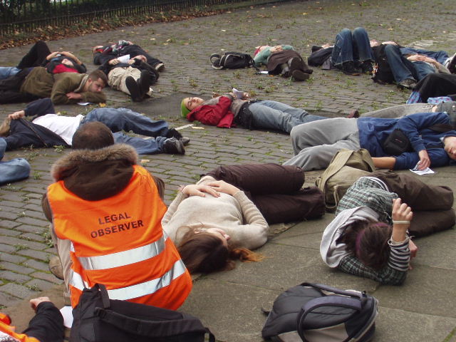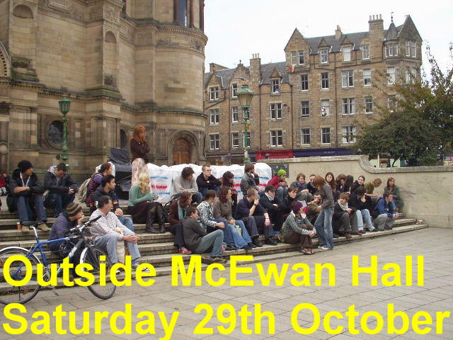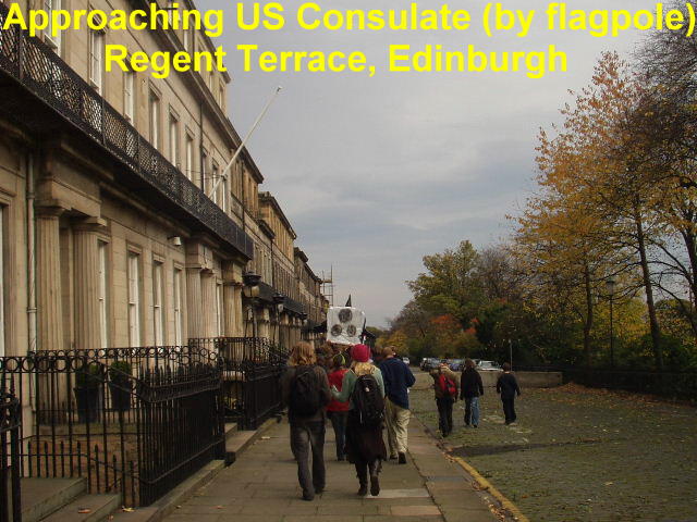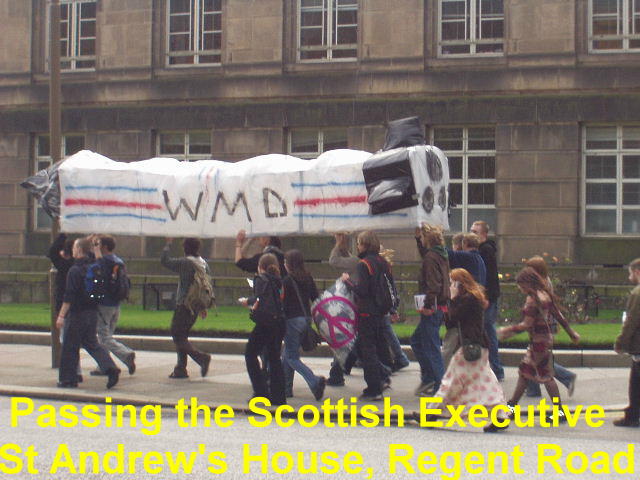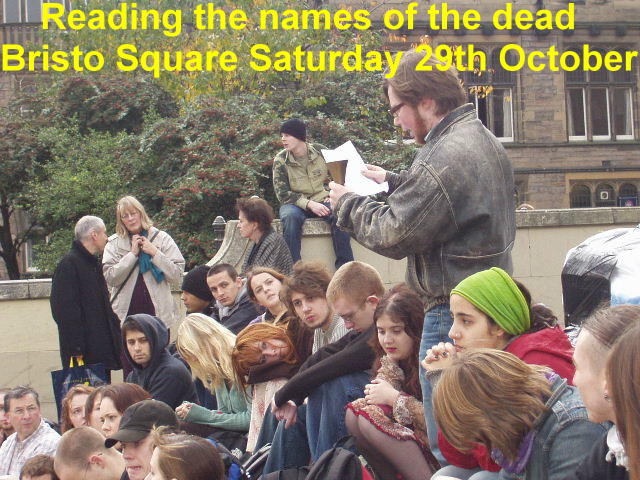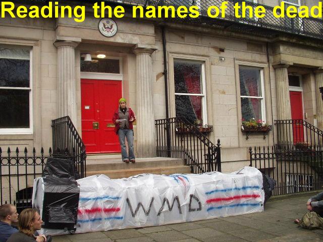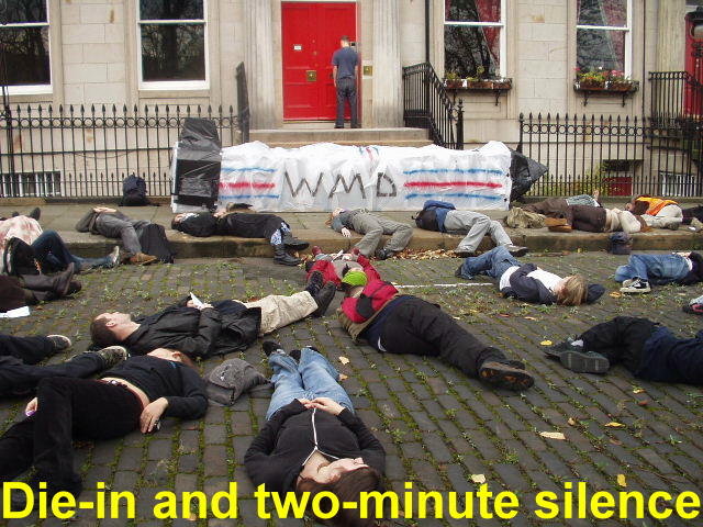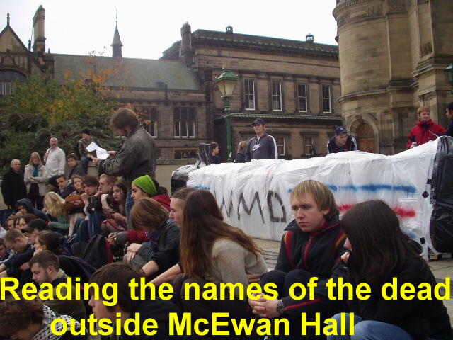 Students from Edinburgh University held a naming of the dead and die-in ceremony on Saturday 29th October. The names of some of the many Iraqi dead were read out near the McEwan Hall in Bristo Square followed by a walk to the US Consulate in Regent Terrace carrying a dummy WMD.