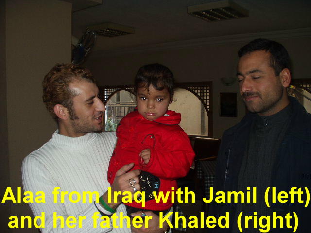 I stayed at the one star Al Monzer hotel near the Abdali bus station in Amman. It’s clean and comfortable but at 6JD (about ₤5) a night it isn’t exactly the Hyatt! The 5 star Hyatt is where long time BBC Baghdad correspondent Caroline Hawley was staying when the bomb went off though fortunately she wasn’t injured. The respectable, responsible journalists of the world can stay in 180JD (about ₤160) a night hotels where the crème de la crème stay, while us mere bloggers must mix with the back packers and refugees in somewhat less salubrious surroundings. Talking of refugees I met a family who had fled war torn Iraq - there were just three of them, the mother, father and three year old daughter. They had lived in Al Qaim, an oasis town just 12km from the Iraqi/Syrian border. The savage US bombing of the town resulted in hundreds of deaths including 9 (nine) members of their family. I have enclosed some photos of the little girl Alaa and her father Khaled, the mother who had lost an eye and was badly disfigured declined to be photographed. They were such nice people - the little girl was a bundle of joy always running around and playing and being friendly to strangers. It makes you feel very angry that people like this are targeted or `collaterally damaged` by indiscriminate firepower from the world’s mightiest military machine.