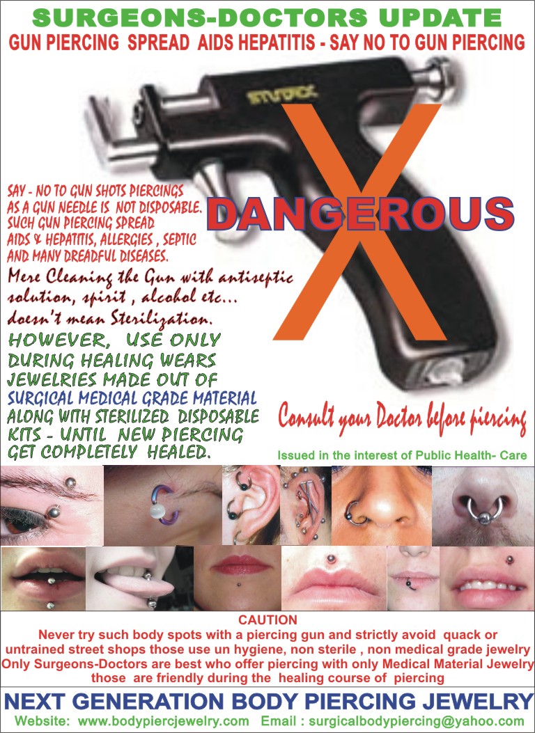 All such surgeons who are into or not yet into body piercing profession - have a variety of views for body piercing - but their common to similar body piercing stands is –‘If surgeons-doctors won’t take over – quacks will ’ . And the day will be near- when aids, hepatitis , septic would become a grave part of exposure due to body piercing which are done by non medical persons or quacks in India - who doesn’t even understand anatomy or abc of human body.