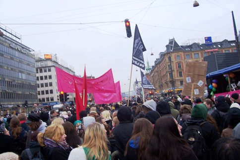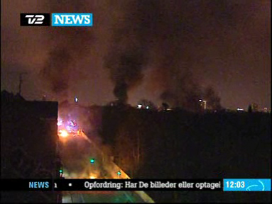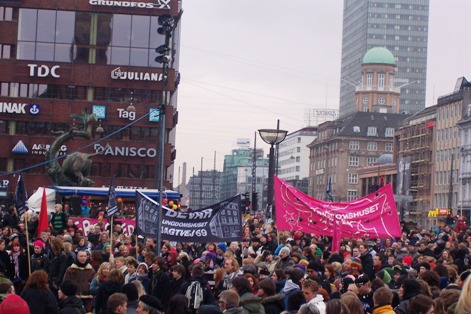 Three good musicians played John Lennons “A working class hero” – and then the demo draw on direction Nørrebro. Slogans as “ Police, control create more violence!” were heard in the streets and here and there banners hangs out of apartments to express citizen support to Ungdomshuset. Around 18.30 the demo ended in a party in the park of Nørrebro. Small groups moved towards inner Nørrebro.