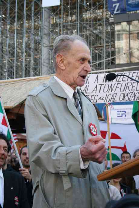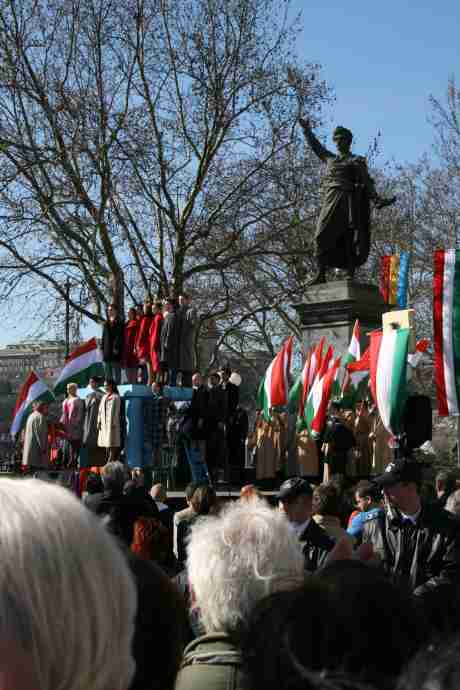 http://portland.indymedia.org/en/2006/09/346537.shtml. Protesters wave Hungarian and "Arpad" striped flags during the right wing party "MIEP" (Party of Hungarian Life and Truth) ceremony of the anniversary of the 1848 Revolution and Freedom fight in the Square of Heroes in Budapest. Hungarian police fired volleys of tear gas at thousands of violent far-right protestors who were staging an illegal demonstration in Budapest on Thursday. Protestors armed with stones and bottles had earlier attacked reporters, according to Hungarian news agency MTI whose correspondent was injured.
