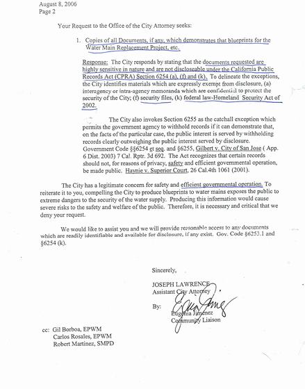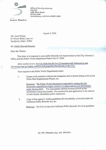 This letter, signed by Eugenia Jimenez for Assistant City Attorney Joseph Lawrence, states that my requests for blueprints and for contracts with private companies are “highly sensitive and jeopardize the security of the City.” You may note by re-visiting the “Public Extermination Project” article that Joe Lawrence also put his name to a letter in 2004 stating that there were no records whatsoever on water work in Santa Monica, California.