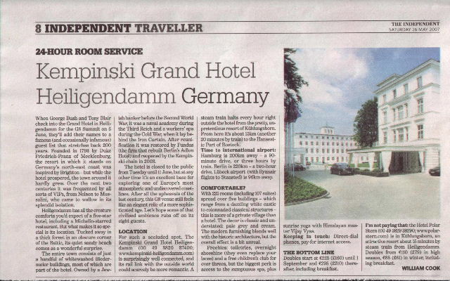 During the G8 Summit from 6 to 8 June 2007 as well as several days prior and after the event, Reservations at the Kempinski Grand Hotel Heiligendamm including all restaurants are not possible.