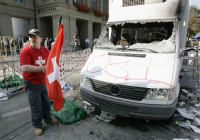 Massive riots stopped the march. At the central place of Bern a huge stage, several vans, mics - everything belonging to the SVP - was destroyed by anarchists and communists. The marchers were not able to reach the place though police fought for them against the rioters.