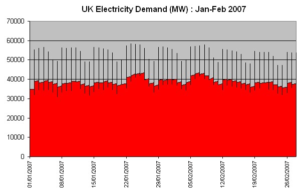 The “base load” can be seen by the red block, moving up and down gradually depending on the weather. The daily load is demonstrated by the vertical lines which show that the highest demand (around 5.30pm) is something like 75% higher than the lowest demand (around 6am).This is a big problem.