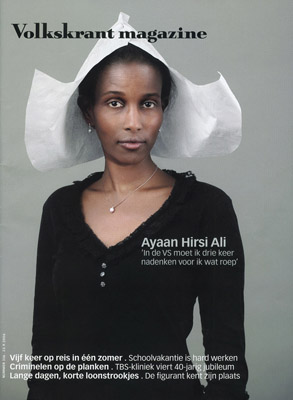 "The young, attractive Somali woman has become a darling of the American corporate media. Ayaan Hirsi Ali started out as a heroine to a portion of the Dutch public, who rewarded her with a parliamentary seat for denouncing all things Muslim. Apparently, flagellating one's own non-white, non-Christian people is a sure route to success in Europe, just like in the U.S. Ms. Ali lost her halo in The Netherlands when it was discovered she had lied on her immigration papers, but was soon recruited into the self-hating Black grouplet at the right-wing American Enterprise Institute, where she pretends to be a "scholar." America - what a country! Denounce your own people, and they'll make you a star."