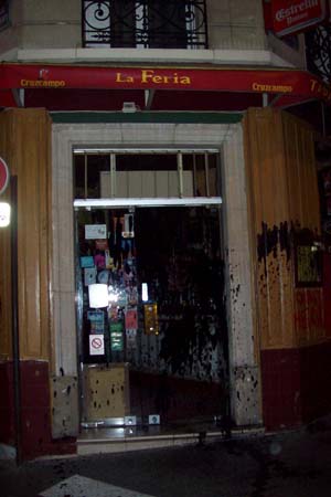 The restaurant 'La Feria' 25 rue Montgallet Paris XIIè. This restaurant serves to his customers animal corpses and supports the bullfight. In the restaurant there are bullfight posters and toreros pictures and... the top: a trophy of a bull's head. Locks of entrance doors glued, windows, walls and pavement of the store were painted. We threw permanent black paint on the walls, windows and doors. We threw 2 big stones that left impacts on the windows. A good idea easy to manage and pretty safe, you must buy a pot of paint, put it into a little plastic bottle and throw the liquid at the highest of the murderers windows.