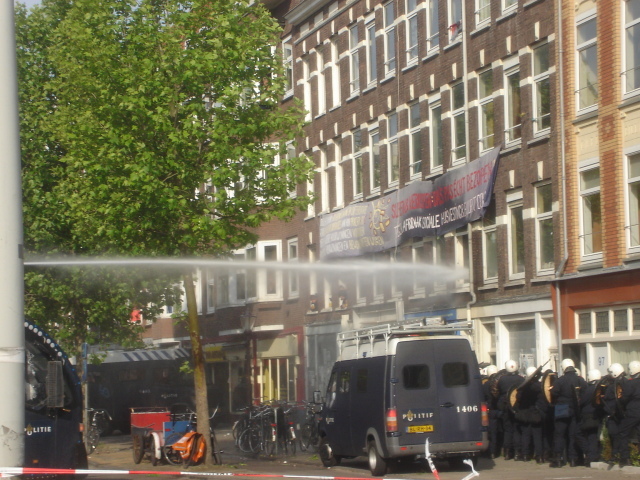 On friday night, there was a birthday party. The police claim that there was a noise complaint from a neighbour, and asked for the identity papers of a person in the squat. They have no legal right to ask for this since the space was not public space but a residence . Afterwards, they tried to arrest this person. The person was de-arrested and took inside by the squatters. From this point on, the police escalated the situation, leading to the eviction of the entire block of 4 houses and the citex social spaces. 51 people were arrested and roughly treated. Currently , there are a few people still inside prison, but most people have been released. On Sunday, there was a demonstration that first passed by the heavily guarded (with dogs) citex-block, where it was made clear that we were not happy. Later, windows of the mayor's house (Job Cohen) and of city hall were smashed. The previous night, the windows of the housing company were also smashed. Because this was an unexpected eviction (citex is still in legal processes and the court results are due on thursday), all people's belongings were still inside. On Monday, the people could luckily get their stuff back through a moving company who took it out. The people were not allowed inside, and there was security, dogs and police all over the area. Riot police and undercover police (civilian clothed arrest teams) arrived many times for no clear reason except to provoke.