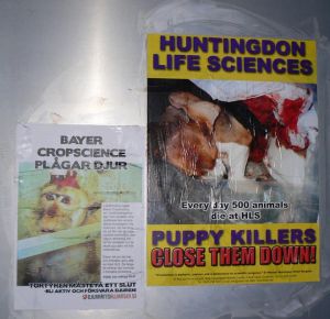 The surrounding neighbourhood was leafleted and stickers put up on lamp posts all over the place. Specially designed posters with information about Bayer's involvement in the dirty vivisection business had been printed and was put up on bus stops, trash cans and well literally everywhere. Since activism isn't exactly common in Staffanstorp this small flyposting actually resulted in an article in the local newspaper. A picture of the poster with the titel "BAYER CROPSCIENCE TORTURES ANIMALS" and a mutilated monkey was clearly shown in the article and the text was great as well. It told that activists had put up posters all around Bayer and that the company have been a target of anti-vivisection protests.