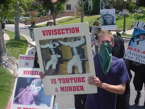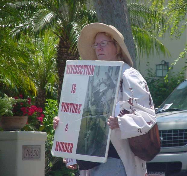 The next stop on the "hit parade" was the vice-Chancellor of research at UCLA, Roberto Peccie. When activists arrived in his neighborhood, Peccie came out to his gate, furious that activists had the nerve to attempt to get redress of their grievances by peacefully marching on a public sidewalk near his expensive home! Well Peccie, get used to the fact that we're not living in a total police state (at least not yet!) and that activists have the constitutional right to engage in picketing. It appears that all these wealthy vivisectors seem to think that because they are wealthy and are protected by the powers at UCLA, that they are above the law; but they put on their pants one leg at a time just like everyone else. In fact, it is not only important to picket those who are engaging in evil and immoral acts against innocent sentient beings, but a duty that we all should entertain.