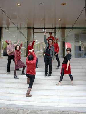 This morning activists involved in the UK Climate Camp coordinated a ‘flash mob’ style action at the office of E.ON Energie. Dressed in splashes of E.ON red, around thirty people swamped the main entrance of the office to give E.ON the finger. Playing on the ‘E.ON F.OFF’ logo (3) from this summer’s Climate Camp the group held their middle fingers in the air, sending a clear message that the multi-national is a target across Europe.