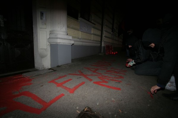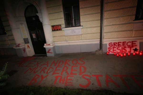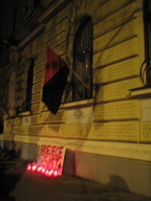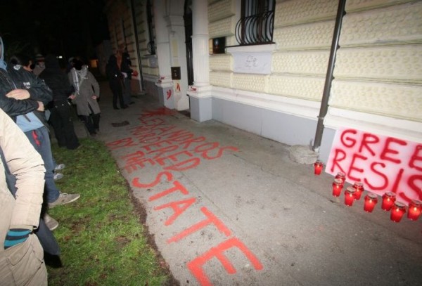 In Germany there have been protests in several cities, including a solidarity demo in Berlin where the Greek embassy was also occupied (de) for the whole day. Demonstrations also took place in Hamburg (de), Dresden (de), Bremen (de) and Cologne (de), whilst the consulate in Cologne (de) was attacked with red paint. The same as in Bologna (It) where the Greek consulate was blockaded and attacked with red paint. In Venice (It) activists occupied the Greek Institute and Consulate. Other solidarity protests include Bern (Swz), Copenhagen (Dk) [more], New York (Us) [Pics], Toledo (Sp), Madrid [Pics | Video], Barcelona [Pics 1 + 2 | Video], Melbourne, Ljubljana, St. Petersburg, Amsterdam, Oaxaca and several Russian cities. Further calls for solidarity demos have been made in Glasgow, and Dublin.