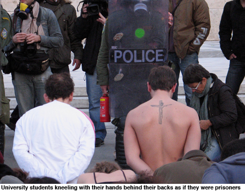 Later on some university students protested in front of the assembled police lines, taking off their shirts and kneeling with their hands behind their backs as if they were prisoners.