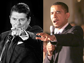 Barack Obama just loves Ronald Reagan, the late president but still idolized leader of the American right wing. During his campaign for the presidency Obama famously said that unlike Ronald Reagan, Bill Clinton didn't transform the country in a fundamental way. At the time he was in the thick of his primary battle against Hillary Clinton and the remark was perceived mainly as a dig against his opponent and her husband. When he later said that he would have a foreign policy like Ronald Reagan, it was seen as an attempt to get the votes of rural "Reagan Democrats" in the Pennsylvania primary. It is now clear that Obama's paeans to Reagan were not mere vote getting efforts or jabs at the Clintons. Barack Obama has proven himself to be a true believer in the Reagan revolution.