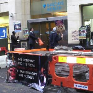 Another great demo at this superb location, as all Barclays' rather better off customers entered and left we got a chance to tell them of Barclays' dirty investments, and to say they where unimpressed would be an understatement! Barclays security would not stop moaning, trying to get us to stand further away and then getting in our faces and filming us with mobile phones, surely you can afford a decent video camera Barclays? Unforunately for Barclays their bully boy tactics carry no weight against a group of compassionate people standing up against the attrocities that take place in HLS. We don't think much of banks like you period, while making the rest of the world bankrupt! Don't really think you deserve all those bonuses and hand-outs from the tax-payers?