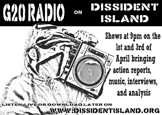 Dissident Island Radio will be hitting the streets on the 1st and 2nd of April to bring you two shows featuring direct action reports, audio from demos, media analysis, interviews, and music over the course of the G20 festivities in London and across the UK.