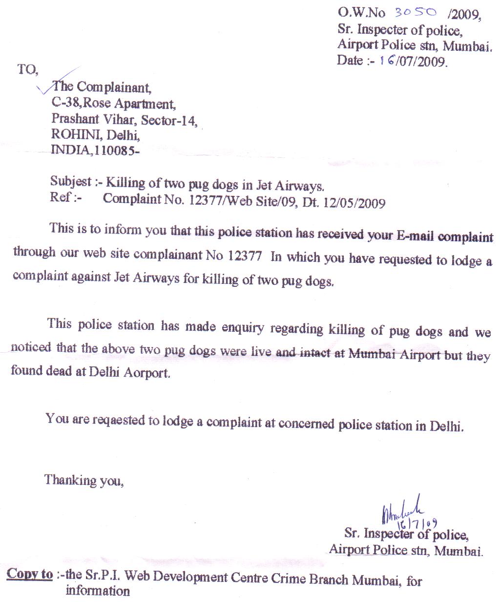 Kindly refer to the media reports about the killing of two Pug dogs in JET AIRWAYS flights, both dogs were killed due to lac of oxygen, hence the International Organization for Animal Protection - OIPA in India requesting you to please direct the concerned officer to lodge complaint against:-